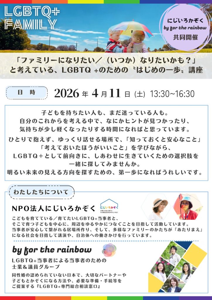 4/11(土)by for the rainbow共催イベント「ファミリーになりたい/(いつか)なりたいかも?」と考えてるLGBTQ +のための〝はじめの一歩〟講座」